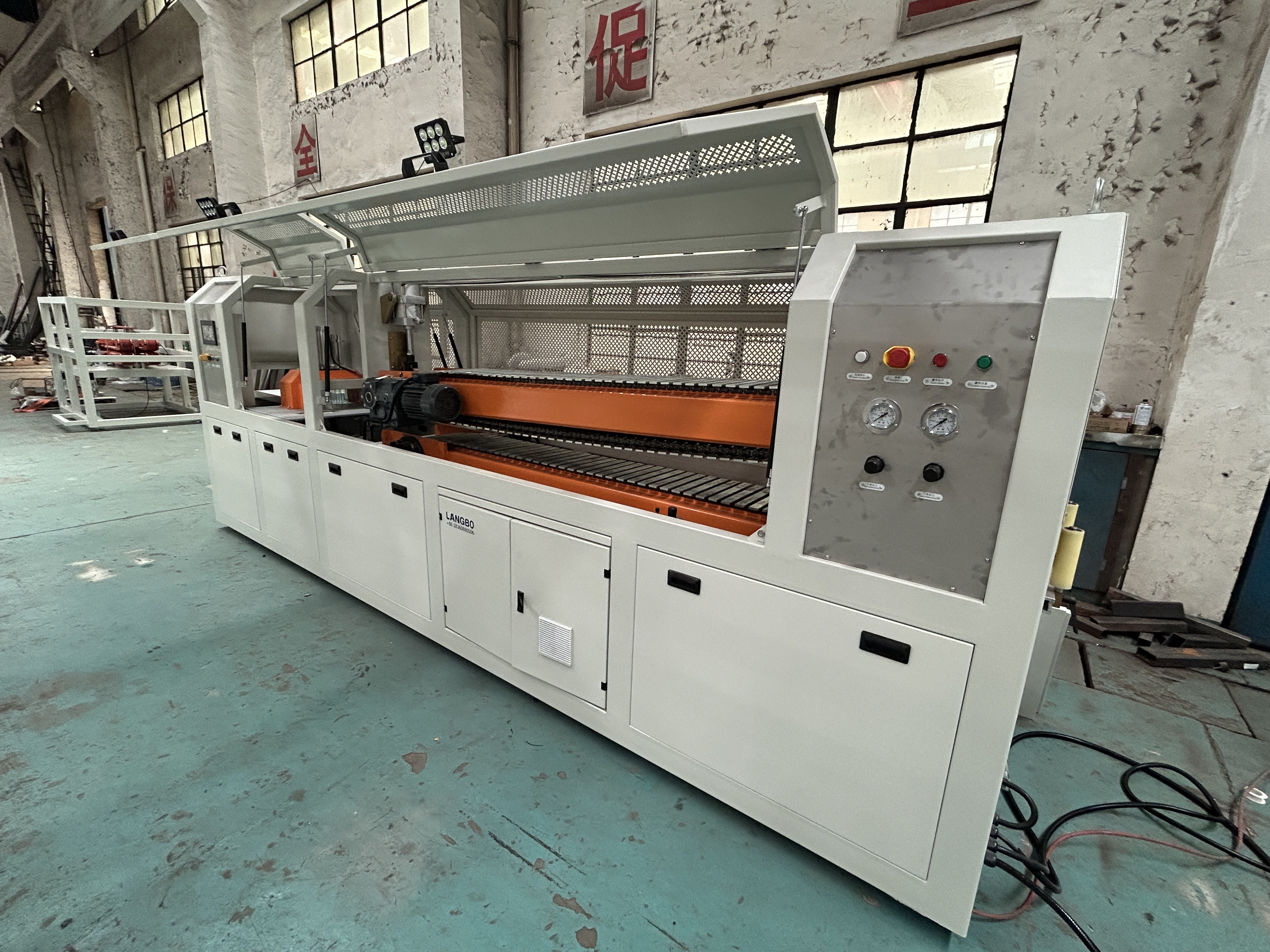 Bu hattın işlem akışı PVC tozu + katkı maddesini karıştırma malzeme besleyicisi çift vidalı ekstrüder kalıp ve kalibratör vakum oluşturma masası çekme makinesi kesme makinesi boşaltma rafıdır.