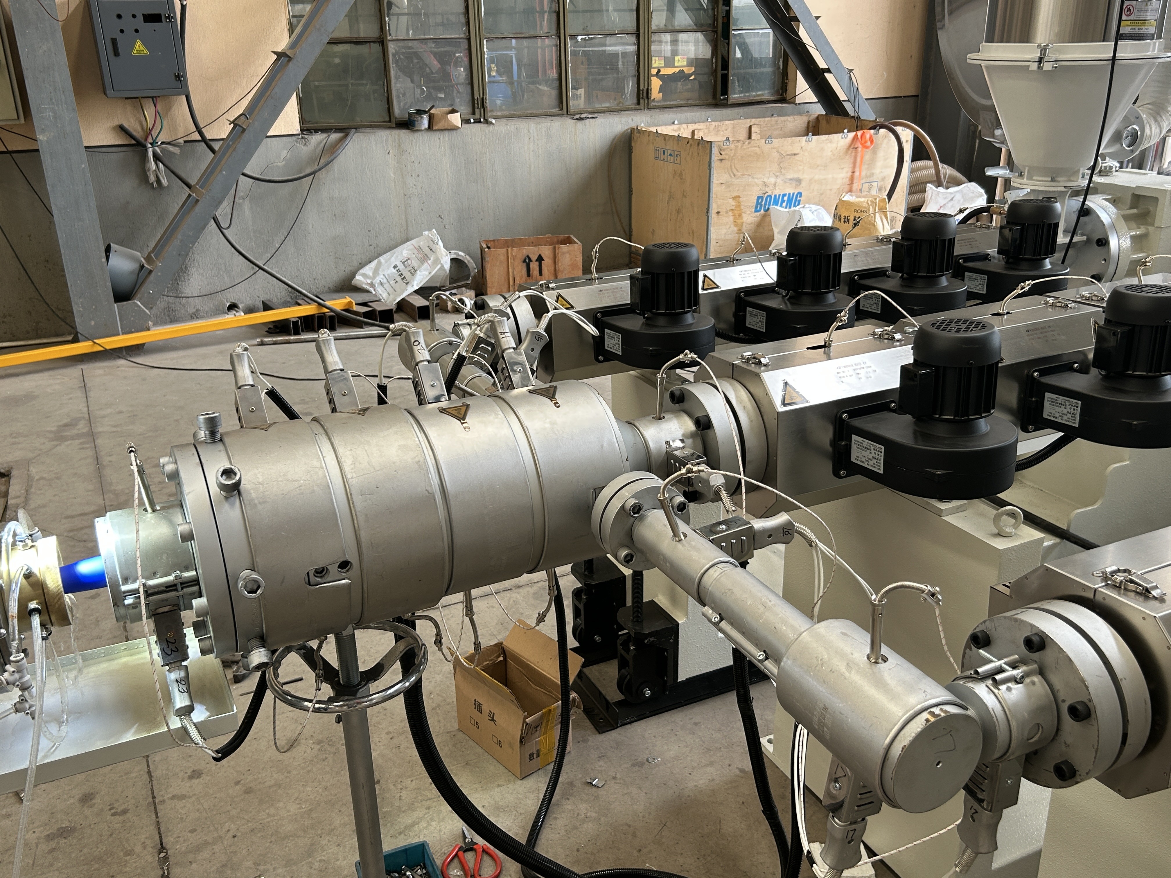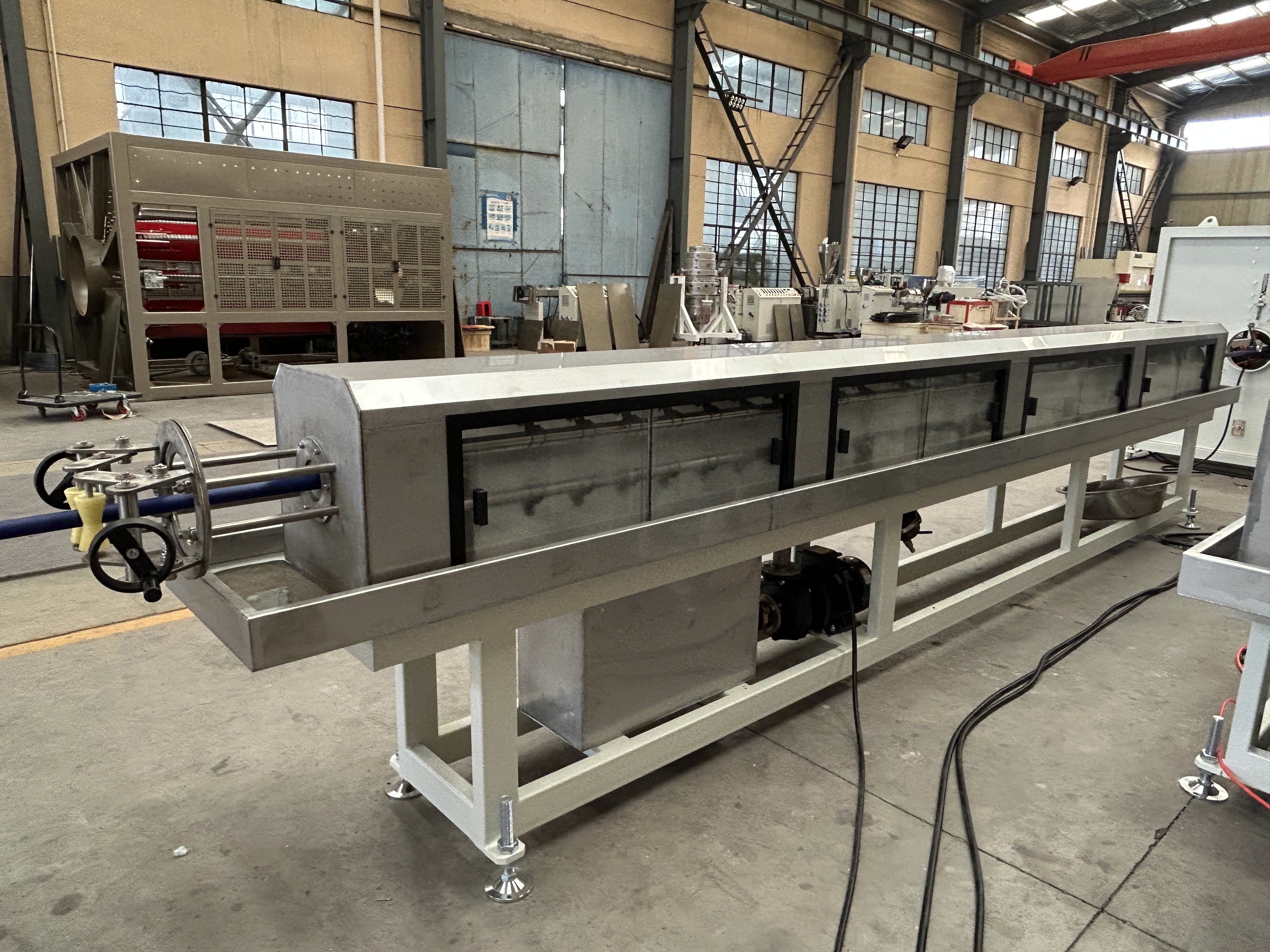 Erimiş plastik, borular/profiller oluşturmak için bir matkap başından geçer, daha sonra hassas boyutlandırma ve soğutma için vakum kalibrasyon tankına girer.