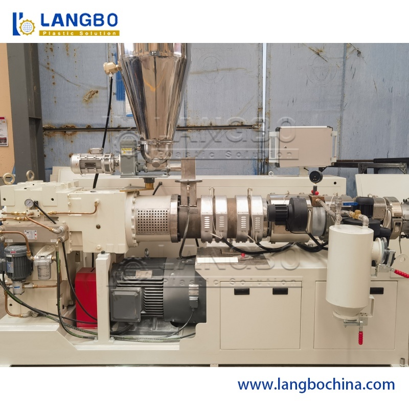 PVC tozu + katkı maddeleri → Karıştırma → Yay besleme → Çift vidalı ekstrüder → Kalıp ve kalibratör → Vakum şekillendirme makinesi → Çekme makinesi → Kesme makinesi → Yükleyici.