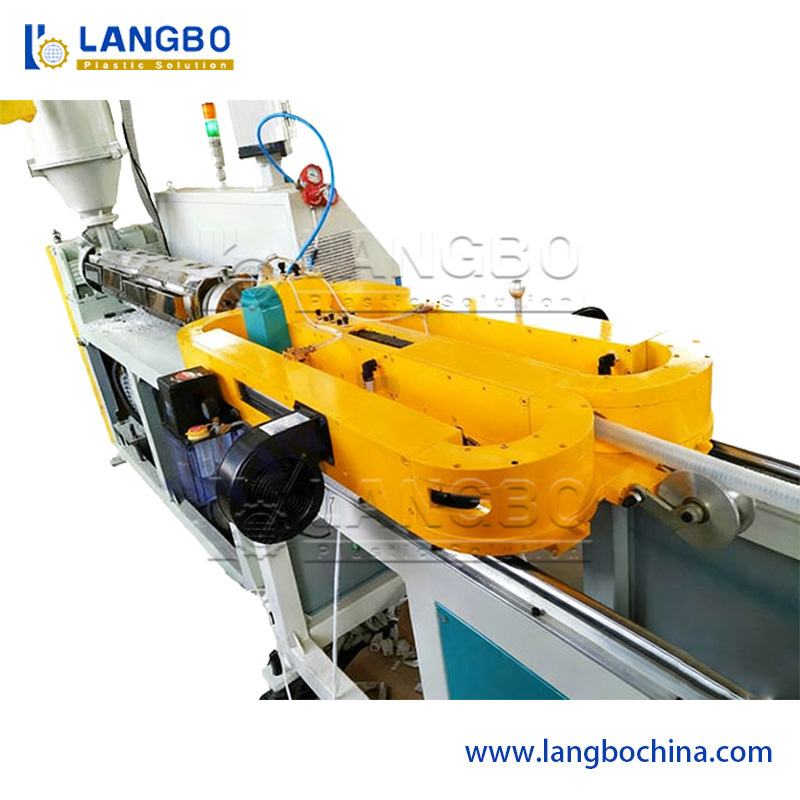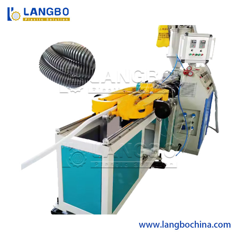 Plastik granüller hopper'a yerleştirilir ve kontrol edilen sıcaklık ve basınç altında ekstrüderde erir.Erimiş malzeme daha sonra vakum veya basınç şekillendirme ile dalgalanma kalıbında şekillendirilir. şekillendirilmesinden sonra, dalgalanmış borular şekillerini dengelemek için su soğutulur. Soğutulmuş borular otomatik olarak gerekli uzunluğa kesilir ve denetim ve paketleme için bobine tarafından toplanır.